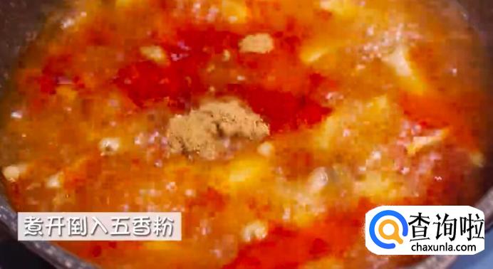 水开之后倒入五香粉搅拌,再转入小火慢炖。