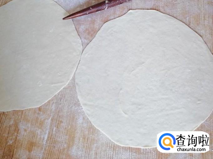 取适量面粉温水和面,和好面醒半小时 ,揪两个小剂子擀成两张薄饼,饼大小根据自己用的锅大小来定。