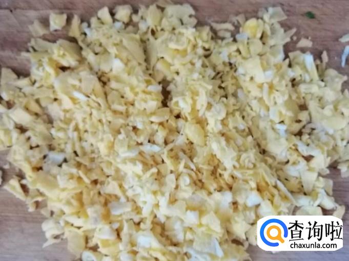 我这里是用了四个鸡蛋,把鸡蛋全打在容器里,煎过放油,煎成如图这样的鸡蛋饼,然后把鸡蛋饼切碎待用。