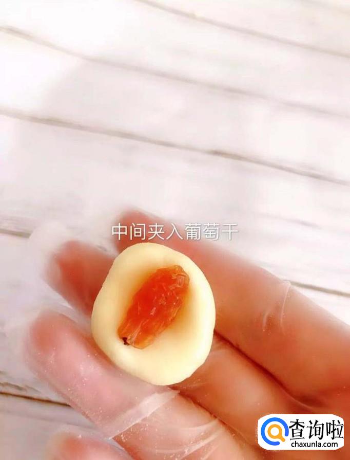然后中间压一下,放入一颗葡萄干,如下图所示。