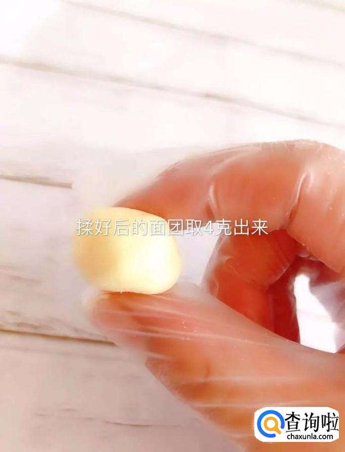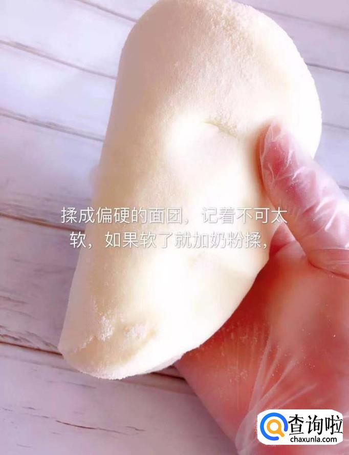 然后把碗中的食材搓揉成较硬的面团,如下图所示。小贴士:如果面团偏软,建议大家多放一点奶粉下去会比较好。