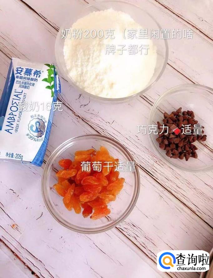 首先准备好酸奶16克,葡萄干适量,巧克力适量,奶粉200克,如下图所示。