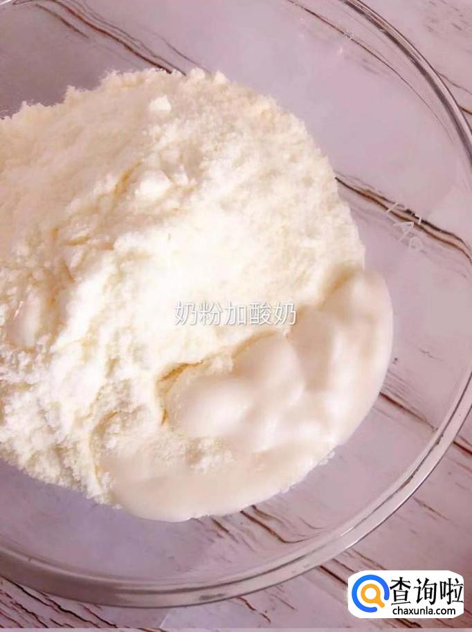 然后把酸奶和奶粉一起倒入碗中,如下图所示。