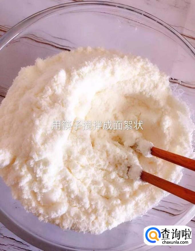 接着用筷子把酸奶和奶粉搅拌成棉絮状,如下图所示。