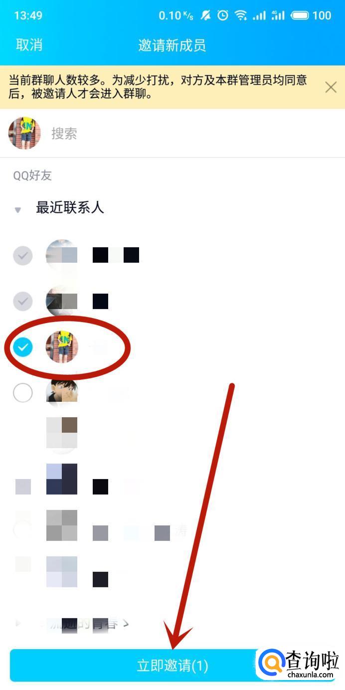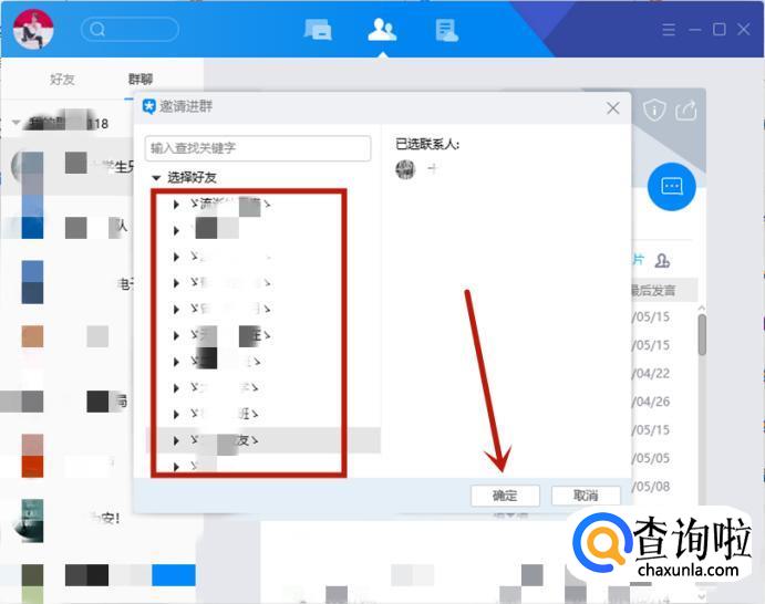 进入弹框页面,选择需要邀请的好友,点击“确定”即可。