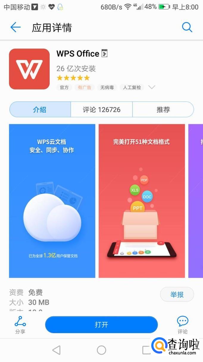 在手机应用市场下载wps office的app并安装,如图所示。
