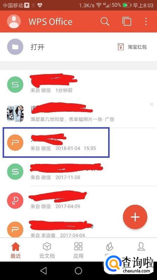 如果你的文档不在本地,可以选择使用云文档打开。点击"云文档",切换视图。