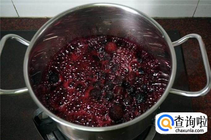 接着我们把清洗干净的杨梅放入锅里面煮,开锅后放入适量的冰糖,熬制汤汁浓稠关火。