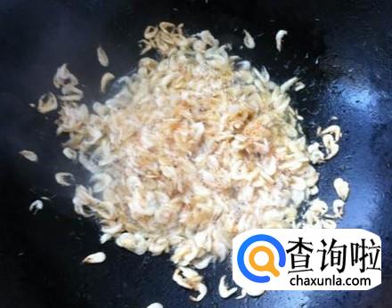 锅中放入食用油,将虾皮放入锅中,快速翻炒,炒至金黄色捞出。