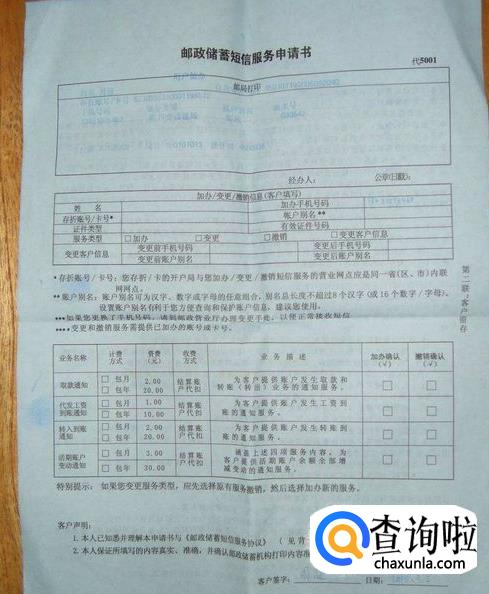 提示:在现场办理需要你填写《邮政储蓄短信服务申请书》和《邮政储蓄短信服务协议》。