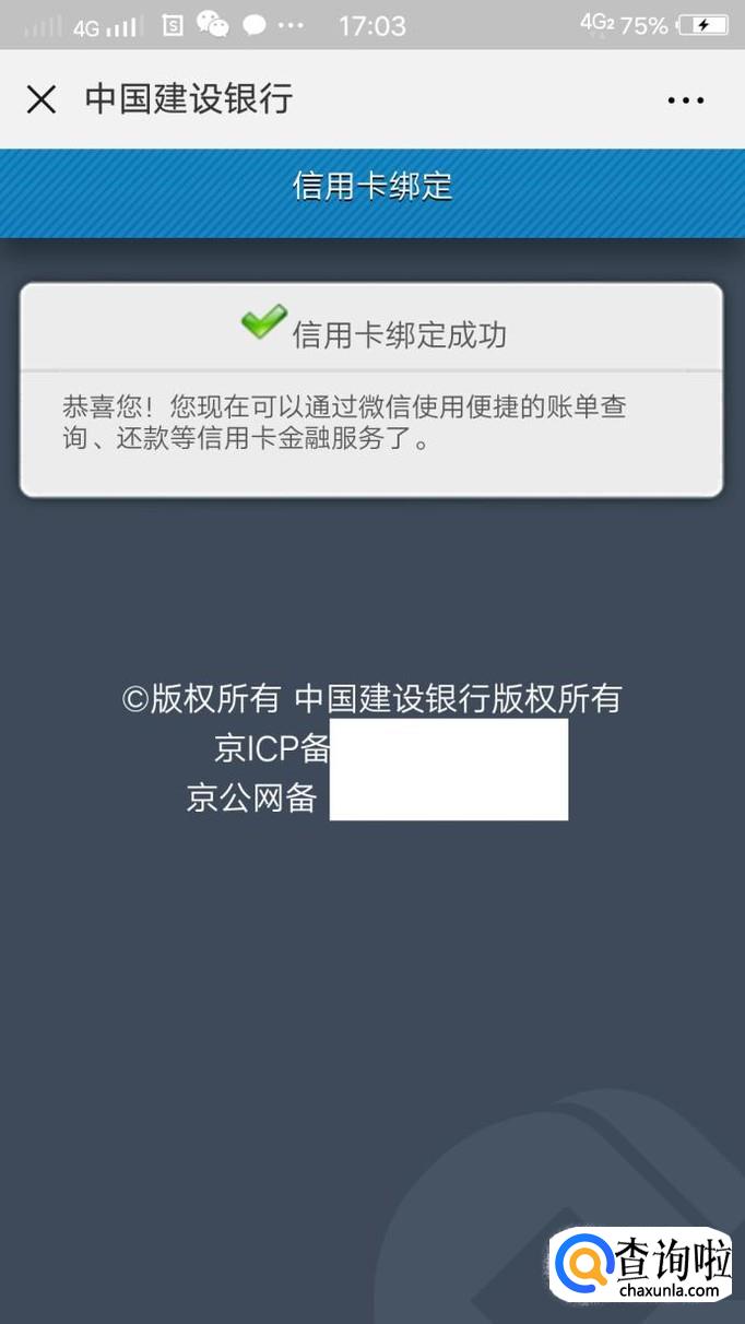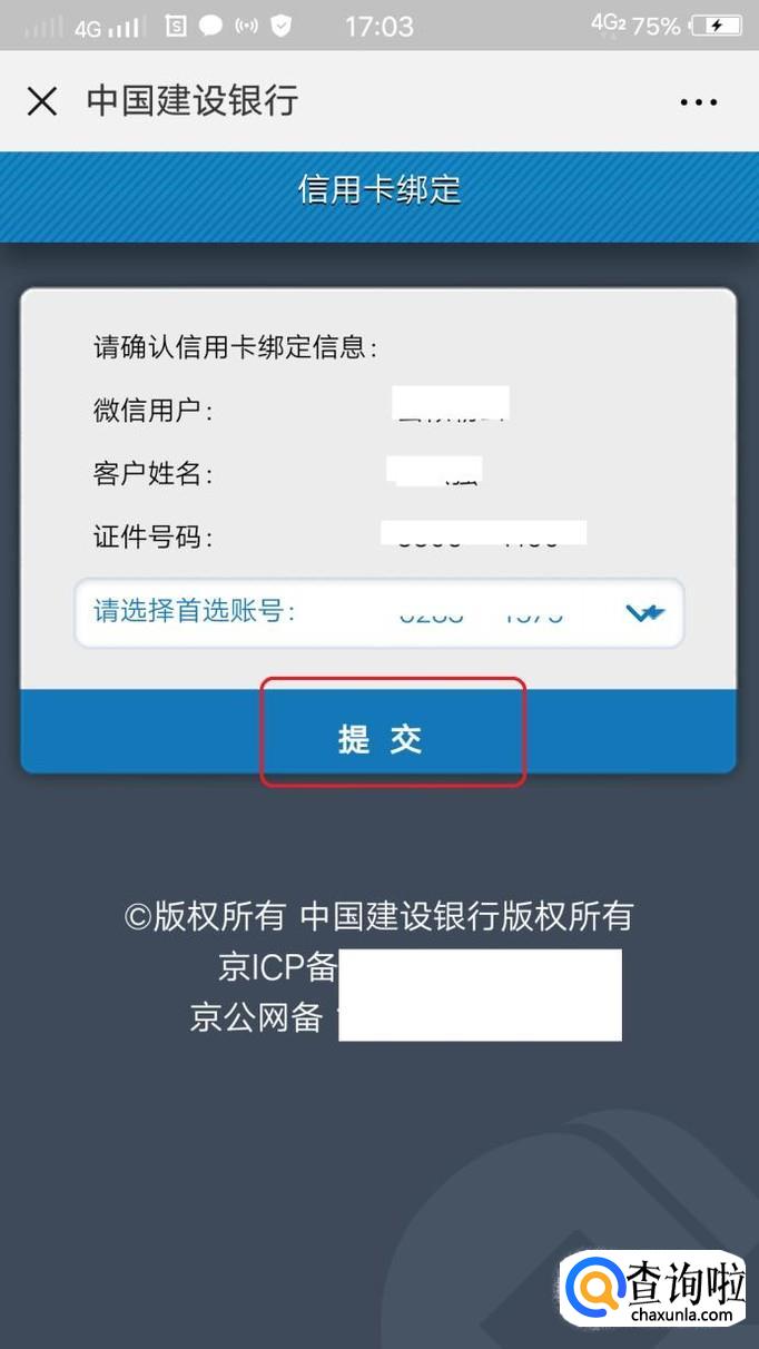 验证通过后,系统会自动匹配与您身份信息绑定的建设银行的信用卡账号,我们点击“提交”就可以绑定微信了,绑定成功,关闭页面即可,下次就可以直接在微信上查询信用卡账单和消费记录了。