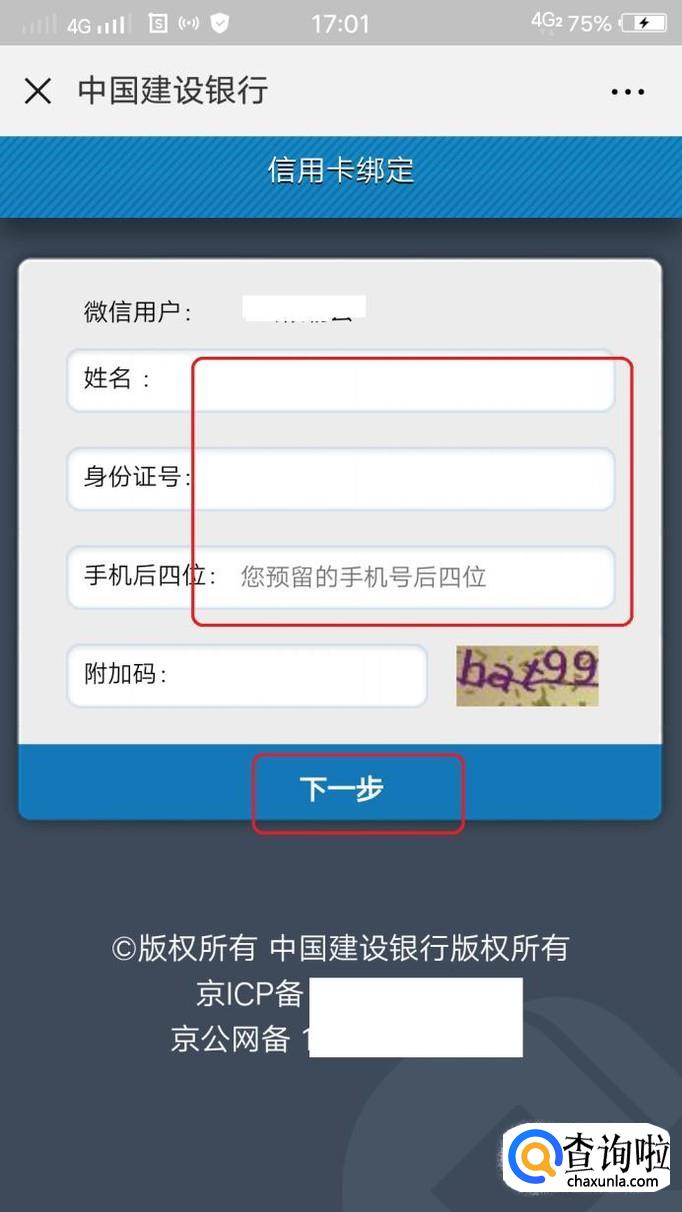进入“信用卡绑定”页面,我们只需要填写身份信息,及您在银行预留手机号的后四位,填写附加码之后,就可以点击“下一步”。