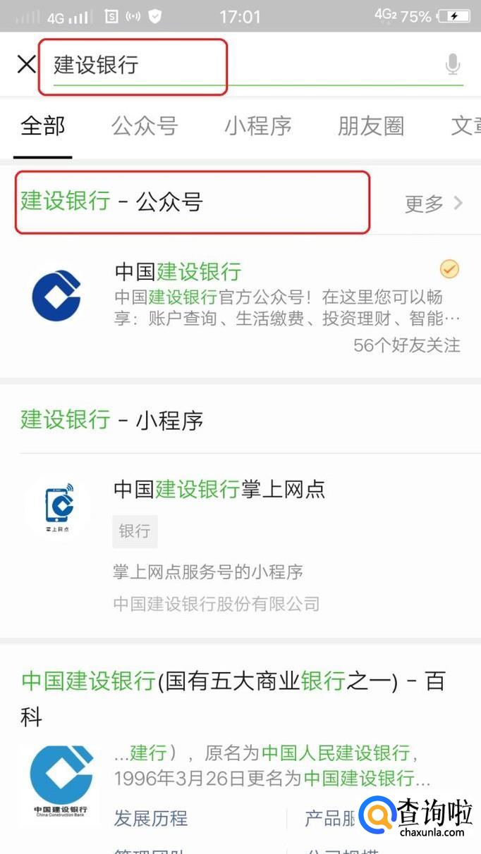 首先,我们需要打开微信,点击微信首页上方搜索符号,输入并搜索“建设银行”公众号。