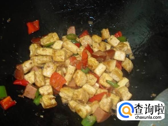 然后加入切好的火腿,豆腐进行翻炒均匀。