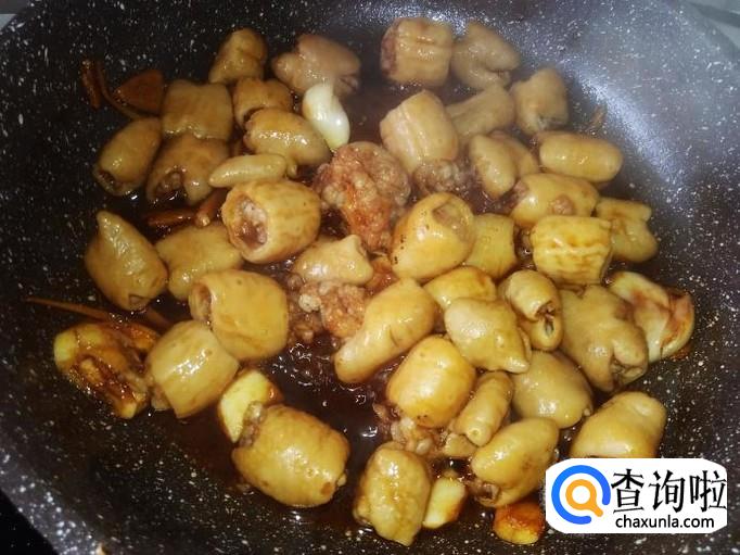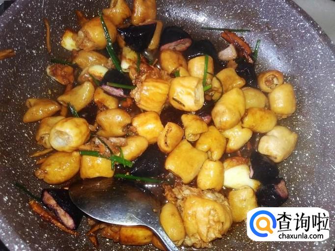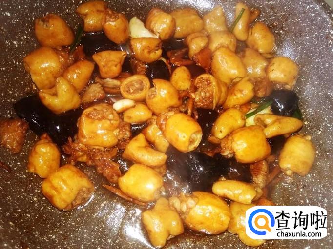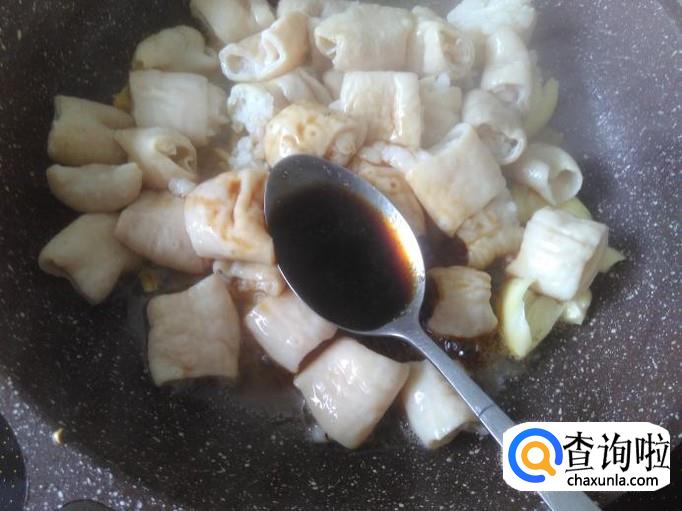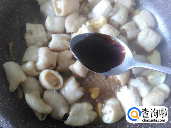 猪大肠500克,榄角50克,姜丝、蒜米适量,1生抽,几滴老抽,料酒适量。