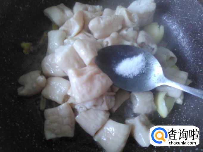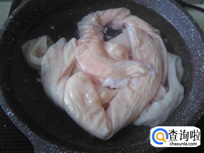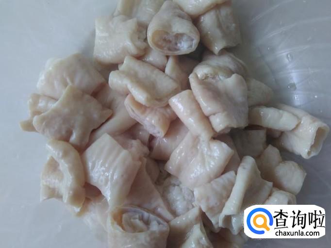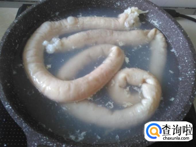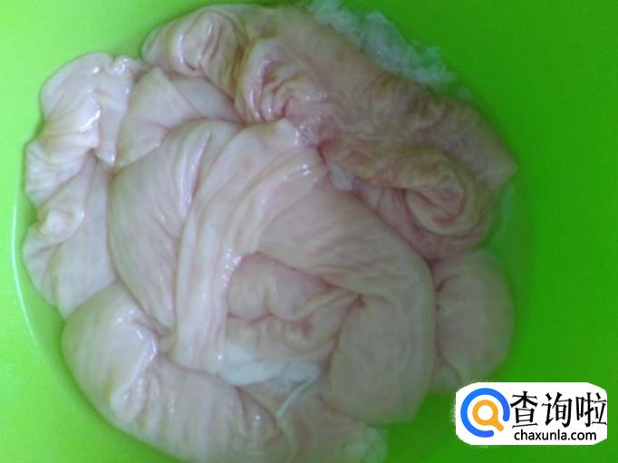 首先把猪大肠清洗一下,然后把大肠里面翻出来,下一抓面粉进去用手抓捏10分钟左右,然后用清水冲洗几次再把大肠翻回来再用水清洗干净为止。