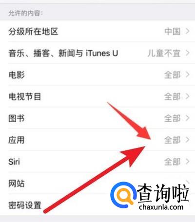 打开允许的内容,找到允许内容,并在允许内容中找到应用。
