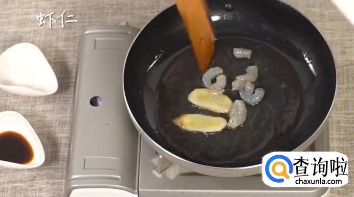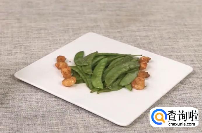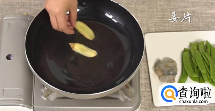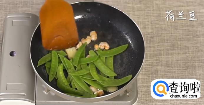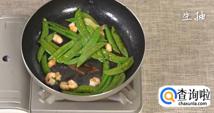 热锅起油,放入姜片炒香后,倒入虾仁翻炒,炒至虾仁变色后放入荷兰豆继续翻炒;炒熟后,加入适量盐和生抽调味后盛出。