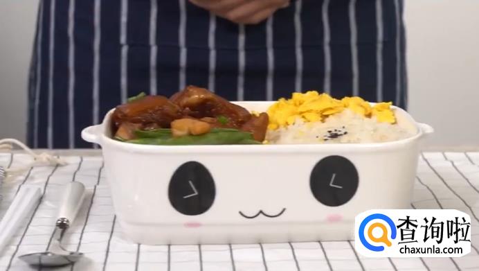 将腐乳猪蹄和荷兰豆炒虾盛入便当盒中,再根据个人口味搭配其他配菜和米饭,这样一个腐乳猪蹄便当就做好了。