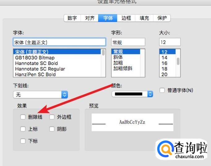 在设置窗口,我们点击‘字体’选项,然后在下方的‘删除线’选框里,点击选中就行了。
