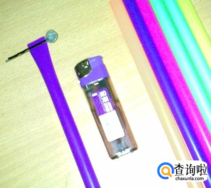 用打火机把大头针烧红,然后压在压扁的吸管顶端,略微卷一下。