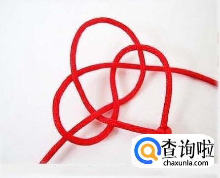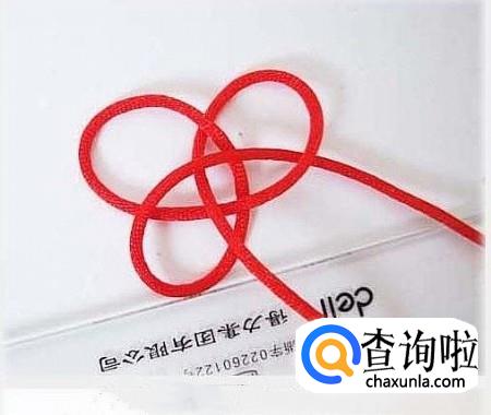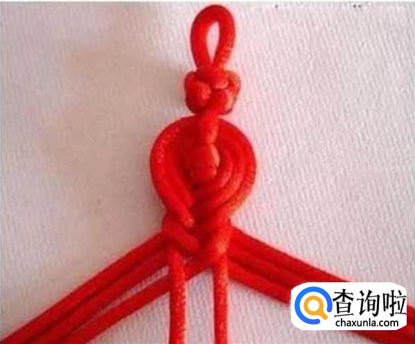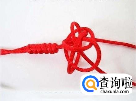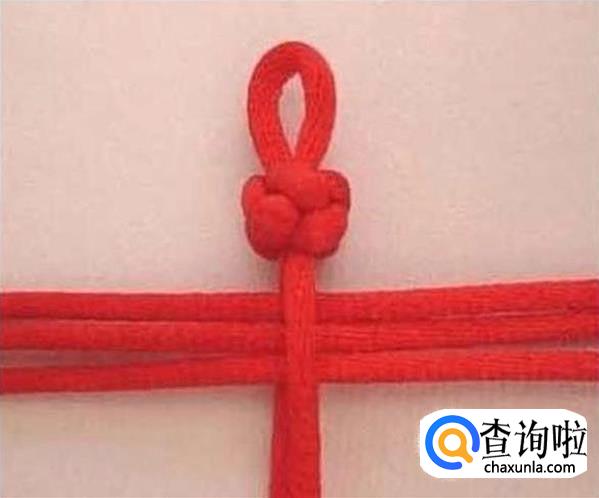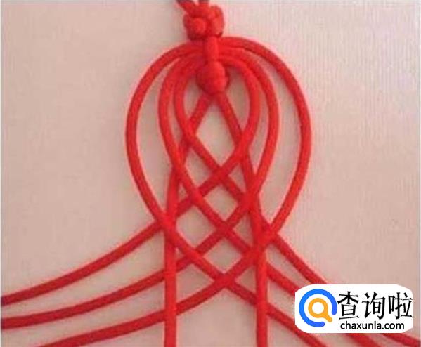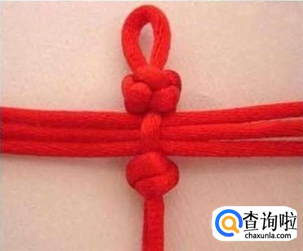 把打了双联结的两条红线牵下来,和上面的三条红绳互相穿过,如图所示,穿好之后拉紧。