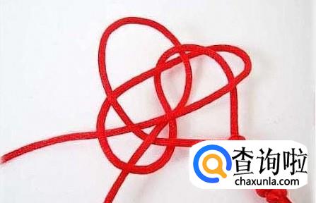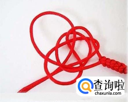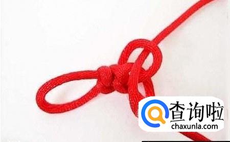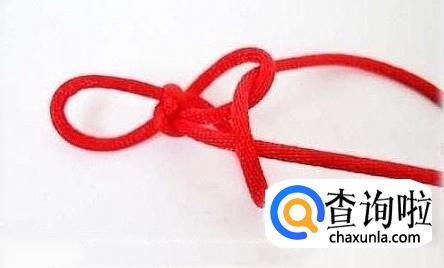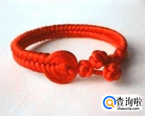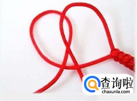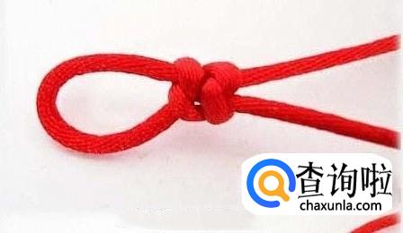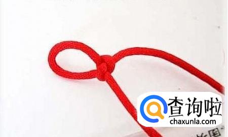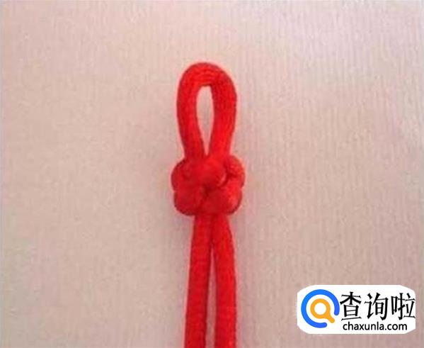 首先将红绳对折,在一端编一个纽扣结,这样做是为了方便下一个步骤能顺利进行,不让红绳跑出来,在编织的时候要注意要在上端留出一个扣眼,如图所示,方便最后的收尾工作。