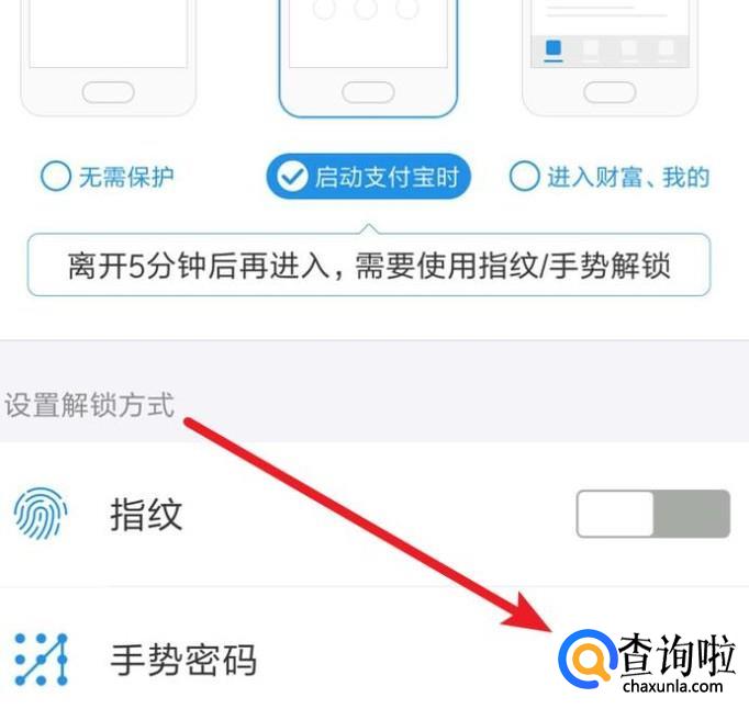 在这里,选择启动支付宝时需要解锁,点击‘手势密码’的开关。