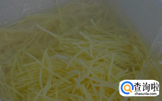 土豆去皮,洗净,切成细丝,泡在水中,这样可以防止土豆丝变色