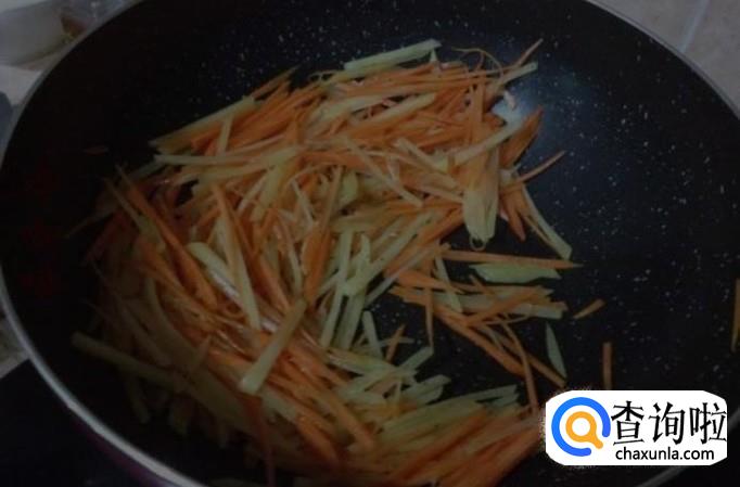 加入胡萝卜丝,翻炒3分钟,加盐,花椒,味精,翻炒均匀,起锅