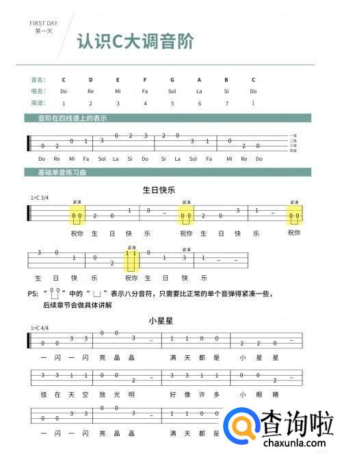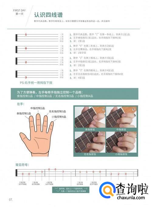 之后开始认识四线谱以及左手与右手的配合,左手不能留指甲,用指尖垂直按弦,指关节自然放松。当初学者学会了如何按弦,了解了左手与右手的配合后,就可以开始学习音阶。