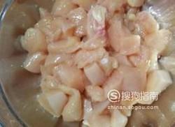 将买来的鸡胸肉洗净,然后切成小块放入盆中,撒上一点盐搅拌均匀,腌制一小时。