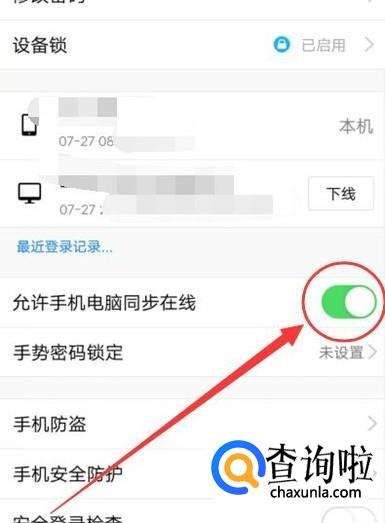进入之后,将“允许手机电脑同步登录”打开,这样就解决了qq不能在电脑登陆只能用手机登陆的问题。