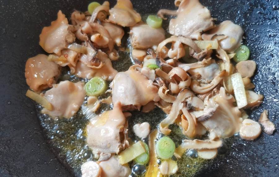 2、尖椒生姜洗净,尖椒切圈,生姜切丝。焯水的蚌肉改刀成小块,锅热油,爆香姜丝。