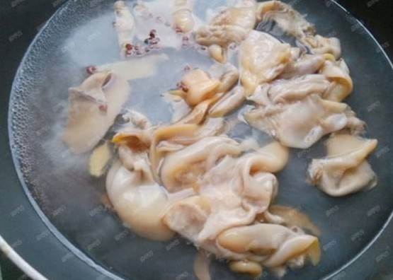 1、河蚌取出蚌肉,取掉泥肠,然后用盐洗干净粘液。锅中烧水,水里放入料酒和花椒、姜丝,然后倒入蚌肉焯水。