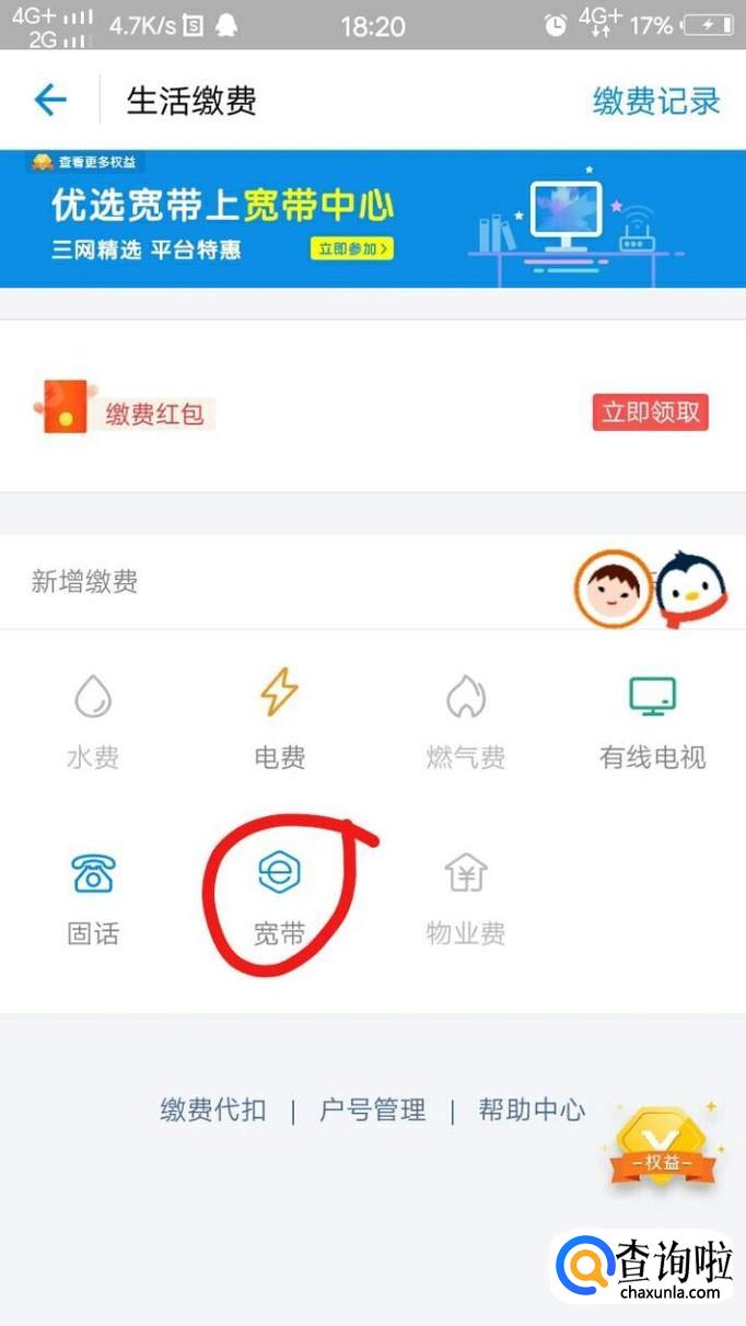 接着,这里面有很多种类的缴费,我们点击“宽带”。