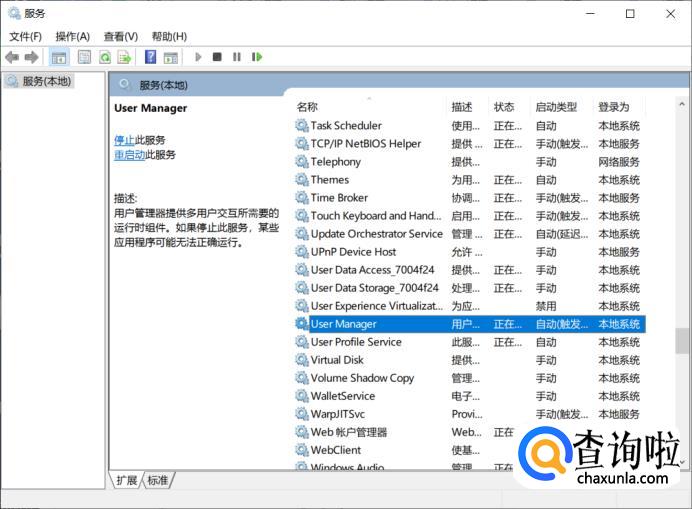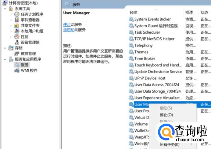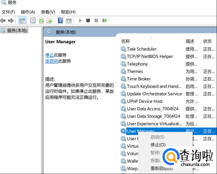 接着返回到“服务”的设置对话框中,鼠标右键”User Manager“,在对话框中选择“重新启动”。