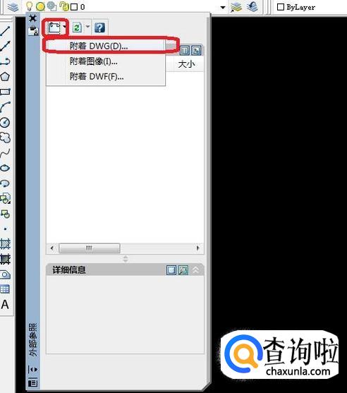 会弹出“外部参照”面板,如图所示,我们点击左上角“附着”按钮,弹出菜单,选择“附着DWG”(根据你参照的图形格式,可以自己选择,选DWG是在别人的CAD图纸上参照制图)。