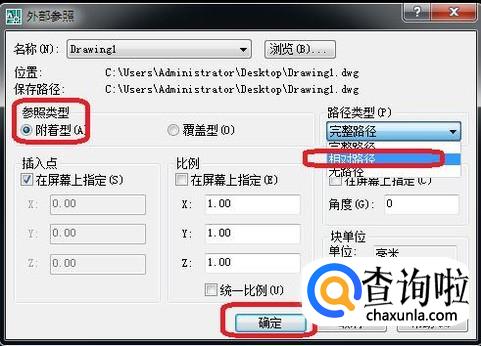 在下一面板中,选择参照类型为“附着型”,路径类型为“相对路径”(有利于以后图纸的自动连接),点击“确定”,外部参照就设置好了。