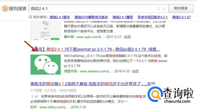 解决办法,我们可以在搜狗浏览器中搜索微信2.4.1,点击第一个,如图所示。(可以登录的版本有2.4.1.79和2.4.1.67)