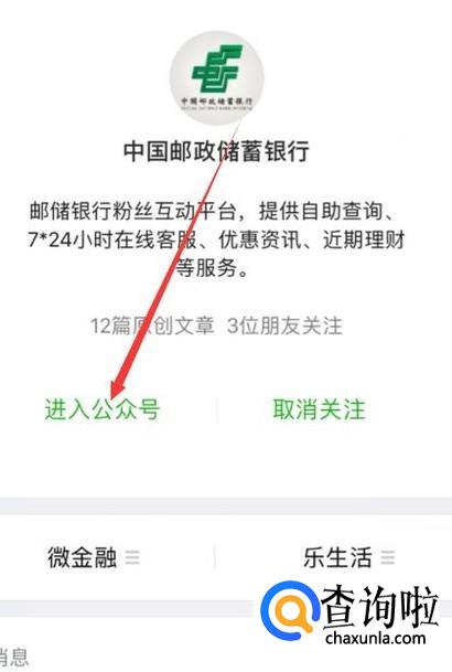 首先在手机里面关注邮政储蓄银行的公众号,然后点击进入公众号