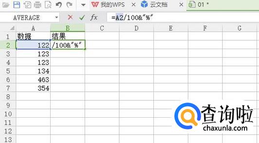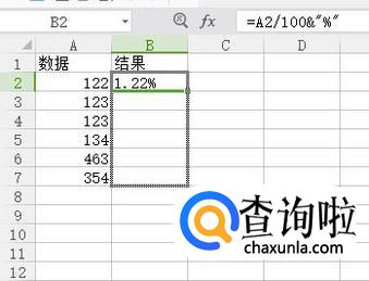 点击一下B2格子,然后在上面的fx函数里面输入“=A2/100&"%"”,再按回车键即可得到A2的百分数。