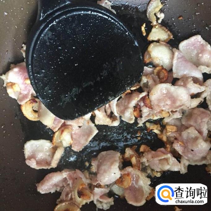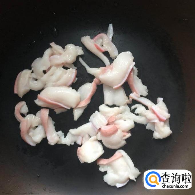 首先将肥肉切成薄片,倒入锅中炸油,如下图所示。