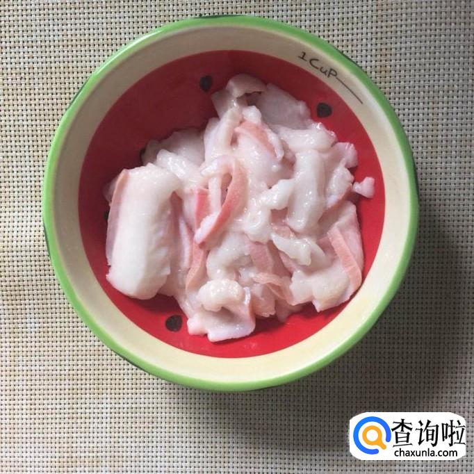 然后把瘦肉切成薄片并用适量的地瓜粉裹一下,如下图所示。
