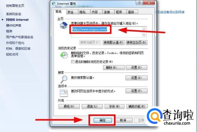 在控制面板中找到“网络和Internet——Internet选项”,点击“更改主页”