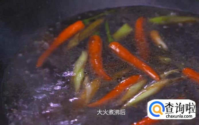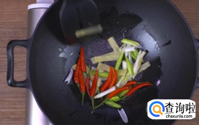 热锅起油,放入姜片,青蒜苗白段,鲜辣椒爆香。