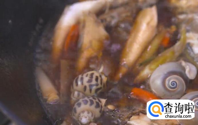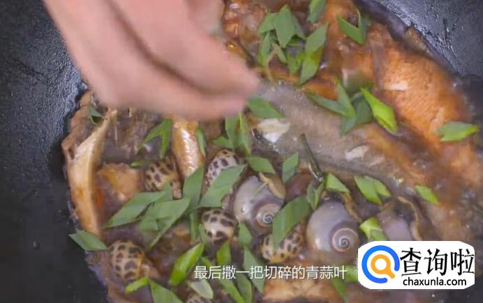 三分钟后,将鱼翻面,加入花螺和香螺,加盖继续焖煮四五分钟。