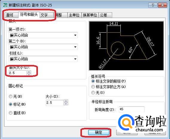 然后对新建标注样式进行设置,如图所示,在选项框中可以对标注线偏移量、箭头大小、文字高度等一一进行设置(点击相应标签即可设置)。设置完成以后,点击确定。就可以对图形进行统一标注了。