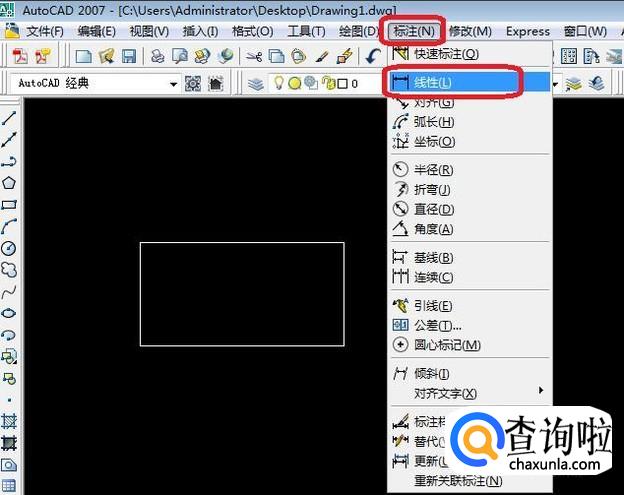 首先,打开CAD图纸,如果是简单图形标注的话,我们直接点击菜单栏“标注”,下拉菜单中选择“线性”。