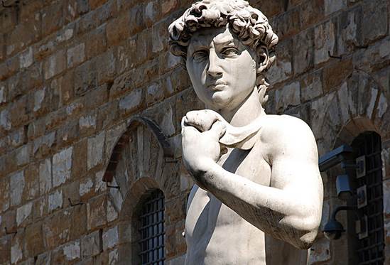 《大卫》像是米开朗基罗的作品,该雕像高3.96米,连基座高5.5米,重量高达5.46吨,它展现了一个年轻有力的裸体男子形象,体态健美、神情坚定、肌肉饱满、有生命力,体现了人体的神圣美与大卫即将迸发出的巨大热情。